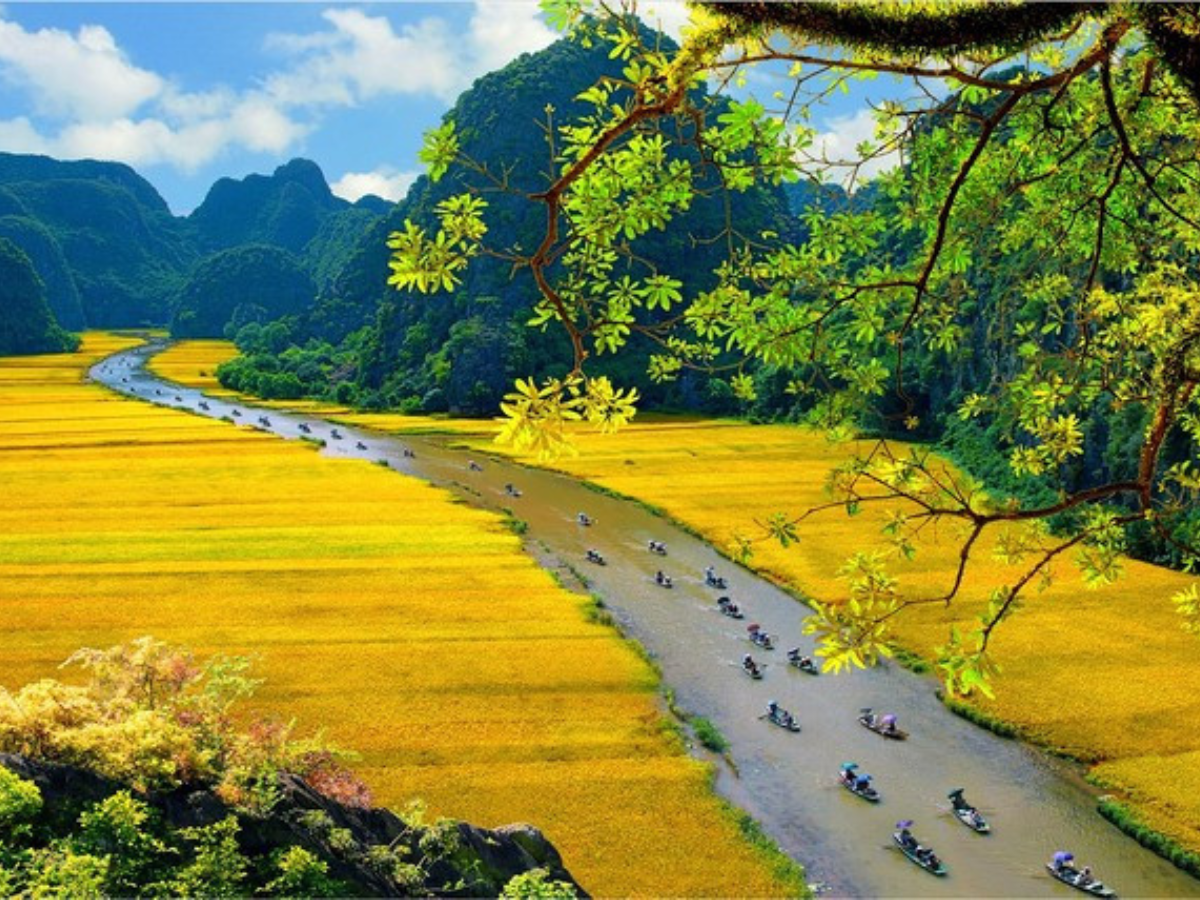 到了五月下旬至六月,三谷 (Tam Coc) 進入稻穀成熟的季節——這段時間被譽為一年中最美的「黃金季節」。這裡的景色變得絢麗多彩且詩意盎然,金黃色的稻田點綴著蜿蜒的吳同 (Ngo Dong) 河。坐在船上輕輕漂流在這片景色中,每個人都感覺彷彿置身於一幅生動的北越 (Bac Bo) 農村畫卷。