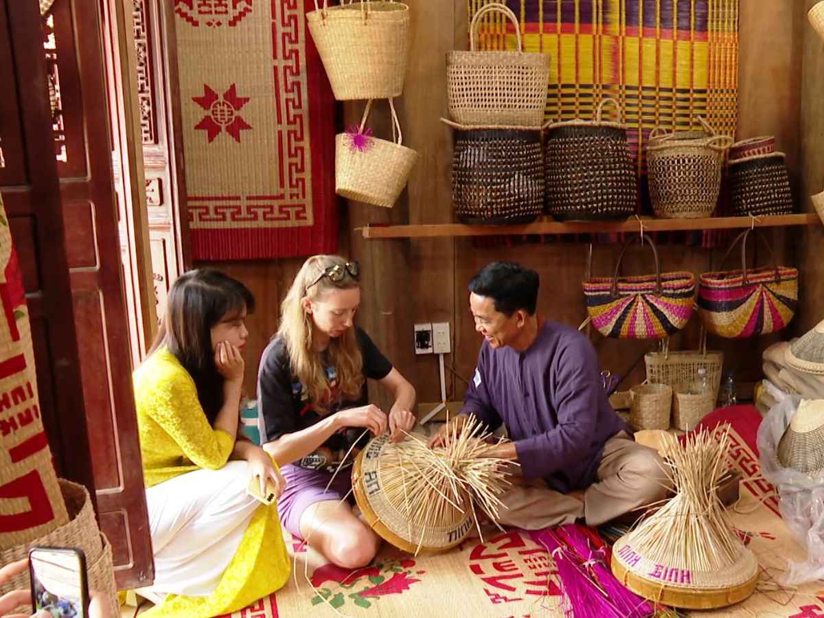 Đến với làng nghề Ninh Bình, du khách sẽ được trải nghiệm trực tiếp các công đoạn cơ bản như chạm khắc đá, thêu tay hay đan cói. Khi tự tay cầm đục, xỏ kim hay đan từng sợi cói, bạn sẽ cảm nhận rõ sự công phu của nghề, từ độ chính xác trong từng động tác cho đến sự kiên nhẫn cần có để hoàn thiện một chi tiết nhỏ. Dù chỉ là những thao tác đơn giản dưới sự hướng dẫn của nghệ nhân, cảm giác làm thử vẫn đủ để bạn thấy được độ khó và sự tỉ mỉ ẩn sau mỗi sản phẩm.