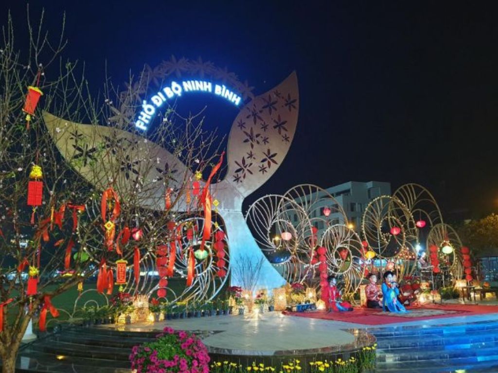 Phố đi bộ Ninh Bình là thiên đường check-in cho những ai yêu thích không gian nghệ thuật và ánh sáng. Toàn khu phố được trang trí bằng đèn lồng rực rỡ, mô hình nghệ thuật và tiểu cảnh tái hiện hình ảnh cố đô, tạo nên khung cảnh vừa cổ kính vừa hiện đại, đây là nơi lý tưởng để du khách ghi lại những bức ảnh lung linh giữa lòng thành phố.