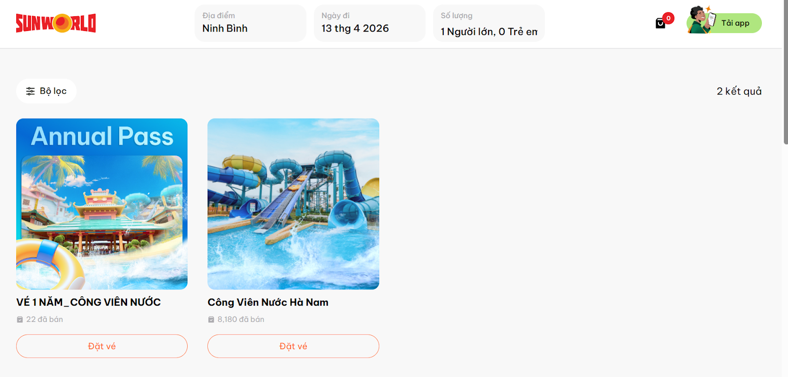 Kênh mua vé chính thức của Sun World là booking.sunworld.vn. Đây là phương án được ưu tiên vì đảm bảo thông tin vé chính xác, đầy đủ và dễ kiểm tra khi cần. Việc đặt vé qua kênh chính thức giúp bạn yên tâm về giá vé, loại vé và ngày sử dụng, đồng thời giảm nguy cơ gặp phải sai sót hay vé giả. Đây cũng là cách thuận tiện nếu bạn muốn chuẩn bị lịch trình trước ngày đi, đặc biệt vào các dịp cao điểm hoặc cuối tuần khi lượng khách đông.
