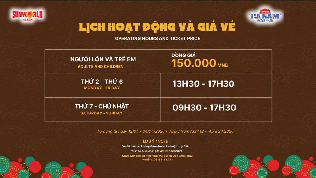 Hiện tại, Sun World Ha Nam áp dụng mức giá cho vé người lớn và trẻ em là 150.000 VNĐ mỗi người, trong khi vé năm (Annual Pass) có giá 1.500.000 VNĐ. Mức giá này được áp dụng từ ngày 12/4/2026 đến 24/4/2026, sau thời gian này du khách nên kiểm tra lại thông tin về giá vé trên trang web booking chính thức của Sun World là booking.sunworld.vn trước ngày đi để đảm bảo cập nhật đúng chính sách và mức giá vào thời điểm đặt vé.