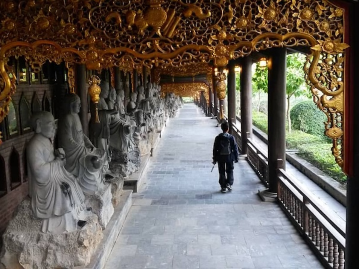 Một trải nghiệm khó bỏ qua khác khi đi chùa Bái Đính dịp Tết âm lịch là dạo bước trên hành lang La Hán dài hàng cây số, nơi đặt hàng trăm pho tượng La Hán với biểu cảm khác nhau. Dù phải đi bộ khá nhiều, nhưng cảm giác thong thả bước giữa không gian yên tĩnh, hai bên là tượng Phật, phía xa là núi non mờ sương đầu xuân lại mang đến sự an yên rất riêng. Tháp chuông với chiếc chuông đồng lớn, vườn Bồ Đề xanh mát hay khu quảng trường rộng lớn cũng là những điểm dừng chân lý tưởng để vãn cảnh, chụp ảnh và nghỉ ngơi sau khi đi lễ.